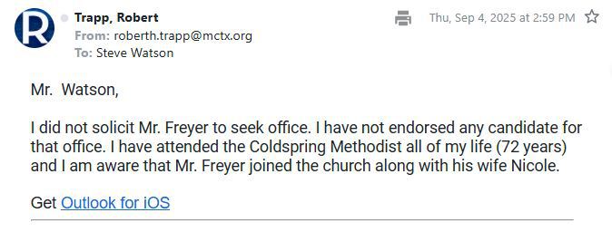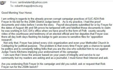Please feel free to download and distribute the emails posted below. I would love to hear about freyers response to being handed one right after he tells that lie again. Judge Trapp's email is there if anyone doubts the veracity of his response to my questions.