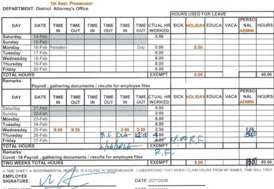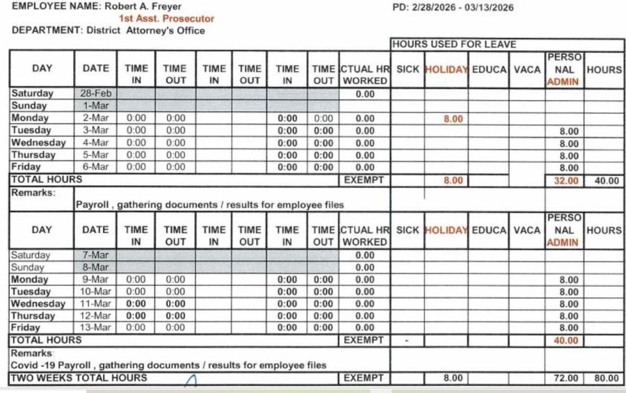 Herein lies the proof that Freyer is a liar, a thief and willing to tamper with govt documents and falsify payroll records to fraud the tax payers. And he wants to be judge? PALEEEESE!!!! Hard pass on that.