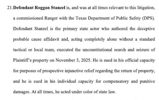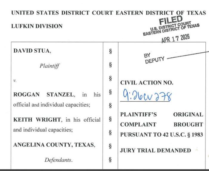 The beleagured Texas Ranger, Roggan Stanzel and the non communicative Angelina County Judge, Keith Wright have both been named in a federal laswuit filed by David Stua.