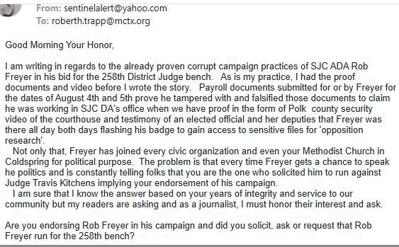 Reliable sources in Austin that bat 1000 with The Sentinel over the years warn that LIAR FREYER'S LIAR FLYERS are glossy, paid for with illegal 'discretionary fund' dollars and headed to a mailbox near you if you are in the Tri District area of SJC, POLK and Trinity Counties. An infamous and experienced liar flyer creator is said to have designed and produced the contaminated mailers for SJC's florida transplant, sir Freyer the Liar.