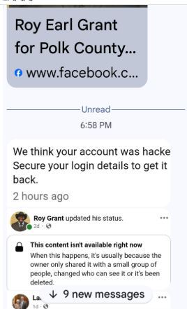 Desperation takes hold in the Polk County political scene as simultaneous efforts to hack Republican judge candidate, Roy E. Grants FB page and The Sentinel's recently regained FB page take place. The attack on Grants popular campaign page were successful. It was taken down by hackers in it's entirety. A page that had in short order registered over 60 Thousand Views was just too much for someone.