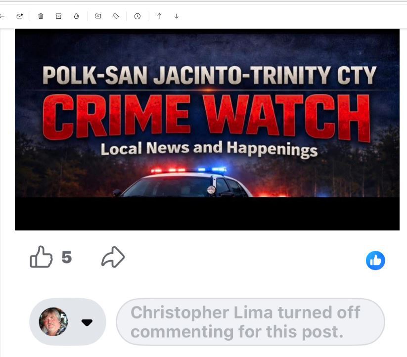 FB has been the medium of getting their message out naming Sam Houston as having taken the dog. These complaints and others have come into The Sentinel for some time from different people. We did confirm that the lawsuit has been filed in the JP 2 court after Judge Ellisor of Pct 3 recused himself.