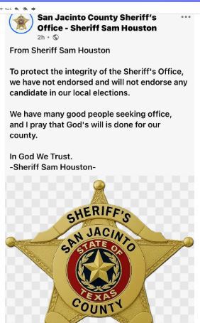 Local San Jacinto County attorney and long time Constable and Justice of the Peace for Pct 4 has filed to run for the office of SJC District Attorney.
