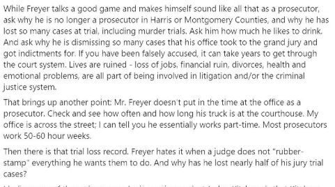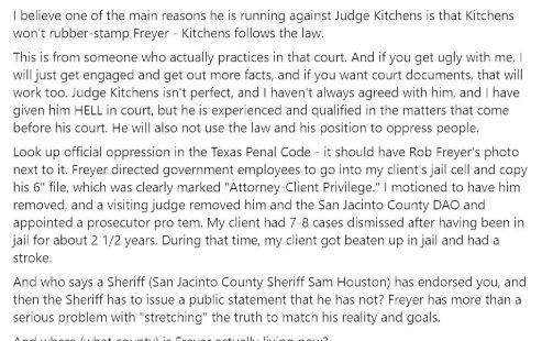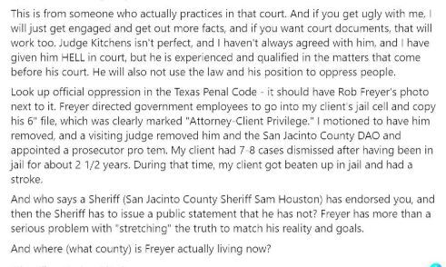 Legal analyst and fact finder for the Conservative News organization, Breitbart has taken to FB in a personal post regarding the 258th District Judge race. In it, Lana Shadwick Price has taken no prisioners with a no reasonable doubt narrative that would make any competent prosecutor proud. LIAR Freyer probably didn't like it much but his incompetence is legendary.