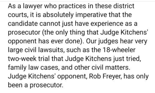 Thanks Ms. Shadwick for your comment. The voters need to pay attention to this election and investigate the background and prior actions of those who seek to sit on this bench and make the serious decisions that a district judge makes, especially in a court of general jurisdiction that hears all types of cases - not just criminal cases - that affect the lives of those who find themselves in court. No one (well at least most normal people) wants to go to court and have the most private and intimate details of their lives discussed in front of other people. EVERYONE is entitled to a fair, independent, and impartial judge - both victims and accused citizens. A judge takes an oath to preserve, protect and defend our Constitutions - it is not an oath to a political party. Politics have no business in a COURT OF LAW. It is unethical for a judge to say how he is going to rule before all parties involve have an opportunity to present their case to the court. The 258th District Court, serving Polk, San Jacinto and Trinity Counties, is a court of general jurisdiction, and it hears all types of cases, as I said in this speech. I did not just move to this area. I moved here in 1978 with my wife and we raised our family here. I represented thousands of citizens over my 41 years of law practice before getting elected your District Judge in 2018. I have participated in countless benefits and events - without seeking any recognition, in all these years - to help MY community. The citizens I have represented for over 48 years since I moved to this area after Baylor Law School, including the victims when I was a prosecutor, and citizens seeking redress of their legal rights since leaving the District Attorney's office, are entitled to no less! Regardless of how you vote, get your ass off your couch, study the candidates (not just this election but all elections) and get out and vote. That precious right to vote has been protected by the blood and sacrifice of my father and those millions of Americans who fought for your rights! And show up for jury duty so you can participate in finding justice for all those who seek it! Justice is not just a fancy 7 letter word - it is essential to our freedom! Thank you - Travis Kitchens