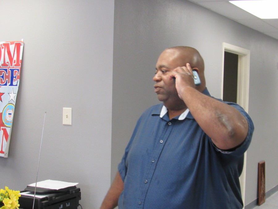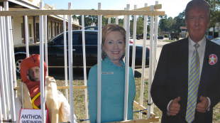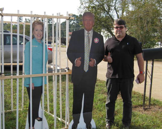 In a personal visit, a two demensional Trump visited with Dwayne Wright to welcome him aboard the national Trump team. The men took time to take care of a chore that needs doing and put Hillary behind bars.
