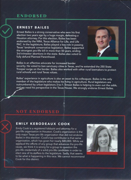 A long time true conservative organization that has been there from the time Texas was a Democratic stronghold (1974) endorses Bailes and reveals the truth about his opponent. A.R.T. correctly points out that the pro life organization that Emily Cook works for is the ONLY pro life organization in Texas that did not endorse Bailes. When you add to that all the lying and misleading ads put out by Cook and her parent organization, it is not rocket science here.