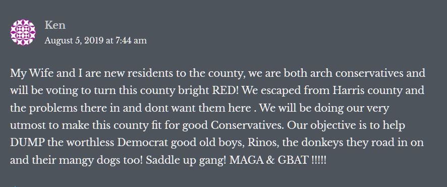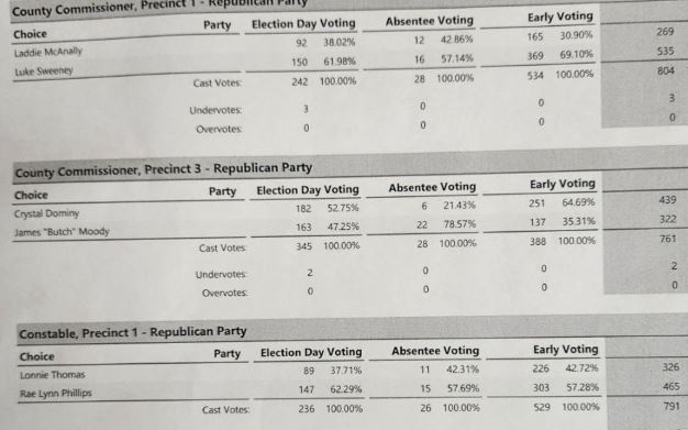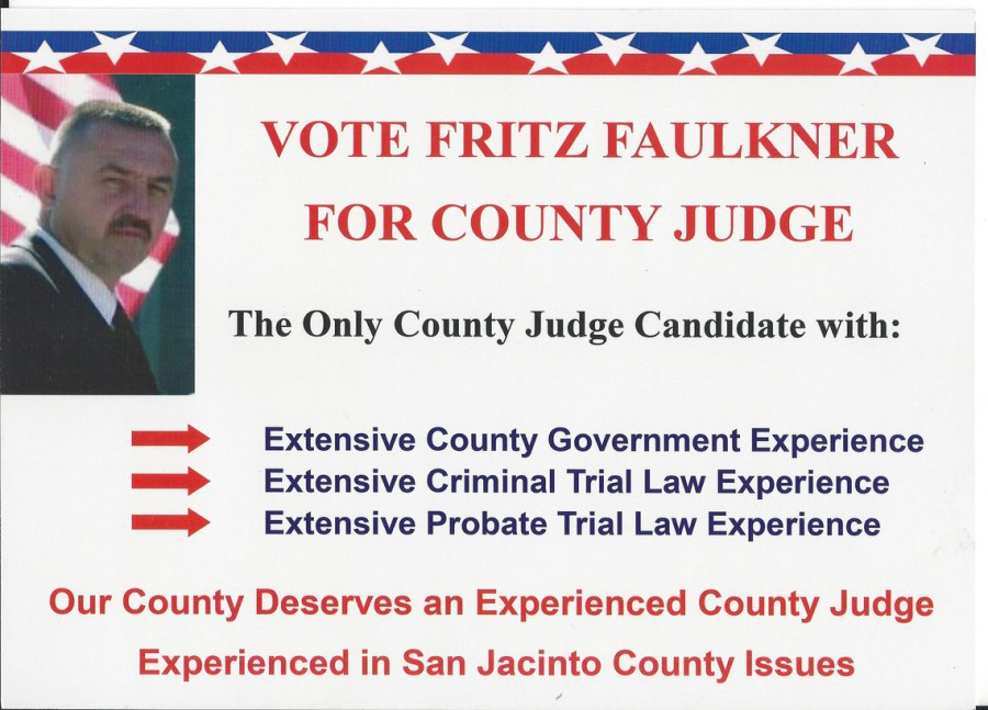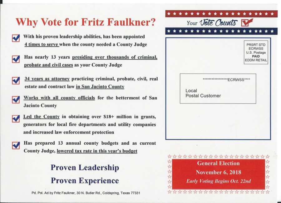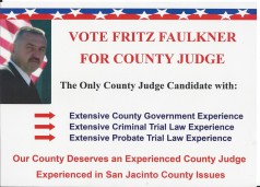 Candidate after candidate, race after race proved the voters in Polk and SJC are tired of the lying attack ads, lying candidates and dark money politics. The overwhelming choices were for men and women of proven integrity and character, traits that far out distanced how they voted in a primary 10 years ago. The message (hopefully) came through loud and clear. Fritz Faulkner walked away with the win in a three way race with over 50 % of the vote. Ernest Bailes stomped all over Emily 'lying ad' Cook even in her home town. (We are collecting all the lying ads we can from her and her dark cartel to ship back. Mail to 50 W Oak Tree Dr, Pointblank, Texas 77364 and The Sentinel will deliver them.)