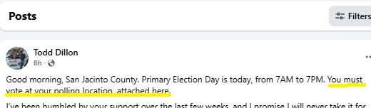 San Jacinto adopted the vote anywhere at any precinct box years ago and it is still in effect. Appears to be an intentional effort to reduce voter turn out. Even though dillon was advised of his error early this morning, the false information is still on dillon's website as of 3;35 pm Maybe his FB social media pro is out of touch and can't make the correction. Sources report dillon's social media expert was chauffeuring him to the polling locations.