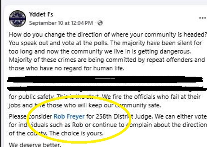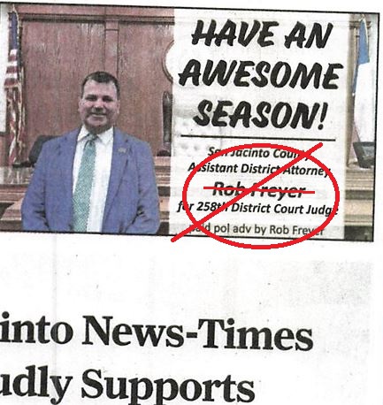 The most telling of all of Freyer's 'low hanging fruit' violations of public decency was being the featured speaker at a criminal's family protest against the 258th District court system on our own courthouse steps.