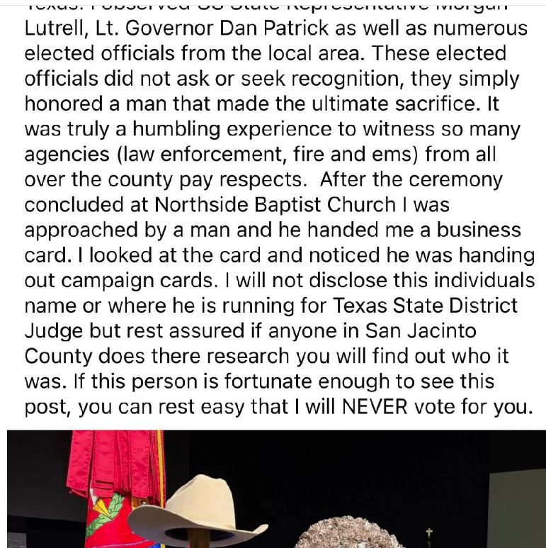 A corporal with the Huntsville PD made the facebook post at left. There is only one candidate for the District Judge bench besides the Incumbant Honorable Travis Kitchens and that is SJC ADA Rob Freyer. Public records prove that Judge Kitchens was in court in Trinity for a hearing.