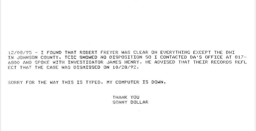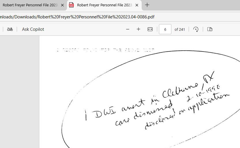 A careful perusal of the employee file on Rob Freyer from Harris county proves that he had two seperate DWI arrests in Cleburne, Tx and Johnson Co. Until we noticed the two seperate dismissal dates, we thought is was just one dwi because Cleburne is in Johnson Co. They are two seperate arrests and both dismissed. His daddy is an attorney too.