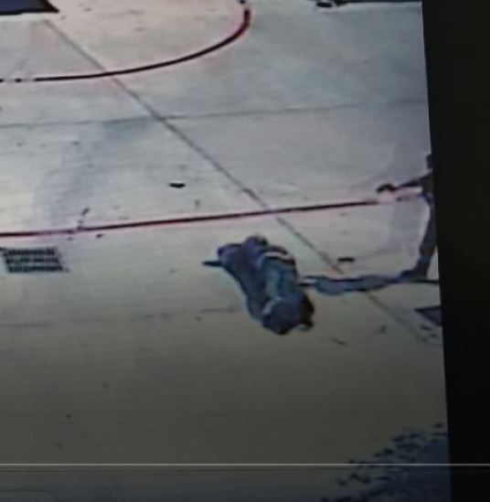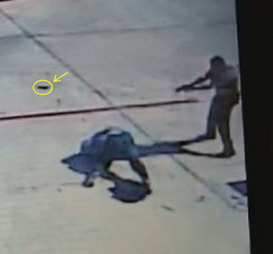 In this next frame (close in for maximum clarity, not to hide anything mcpr), the deputy has just fired the first shot striking the suspect right between the eyes. Note that the pistol had come to rest 12 feet away with the hand grip facing away from the suspect.