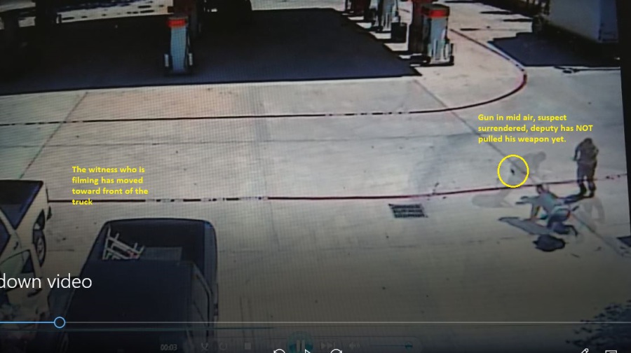 In this frame below, there are two images of the gun which was in motion and two images of the deputy who is still in motion but the suspect is in the same submitted posture with only one image of his body again proving no movement. This shows that the gun hit the pavement 12 feet away in the view and hearing of the deputy and the suspect was already submitted with both hands in plain view. The deputy had time to move over three more feet, finishing drawing his weapon and take aim.