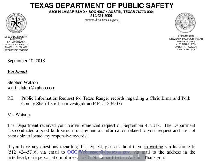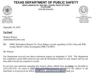 A letter received from the DPS Counsel's office in response to a Sentinel open records request states that a diligent search has been made but they do not have a single document responsive to my request that shows their agency ever received or responded to a request for an investigation in the alleged aggravated assault committed by Lima on April 21st. This letter refutes the claim that Chief Lyons "turned it over" to The Rangers.