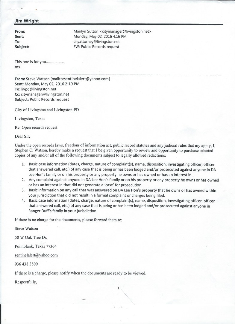 On the 11th business day after The Sentinel submitted the open records request noted below, Asst DA Coleman penned a letter requesting an open records opinion from the OAG regarding the evidence we are seeking. In that letter, Coleman seeks to withold entire documents because they may contain an officer's address, a birth date, a DL number, motor vehicle info, Social Security number and such. We are fully aware that those personal identifiers are not public and addressed that point in the request with the language limiting our request to, "information available by public information laws". That one line excludes the personal identifiers that are commonly known to be unavailable under the open records laws. Coleman knows that, I know that so it seems that the OAG needs to give Coleman a crash course on how to REDACT that information from an other wise public document. Take an incident report for instance. Coleman needs to redact the DL number, the address of the officer if the crime occured at his home and his birthdate and release the rest of the document. Coleman makes the asinine (and time wasting ie: stalling) argument to the OAG that the entire document needs to be witheld because of two lines of entry in the form. He knows better. The most ludicrous objection of all that Coleman makes in his effort to thwart the public's right to know is that the entire Lima file (404 pages) is of, "no legitimate concern to the public." The subject of the open records request was the April 21st incident regarding the allegations listed below plus any complaints filed against Lima for the last 10 years and/or any 'non prosecution' forms signed by anyone in favor or not prosecuting Lima for the last ten years. In respect for Byron Lyons getting all the documents to the DA quickly and for the work load on the DA's office, I have changed the below headline from "Violates Law" to "Stall"