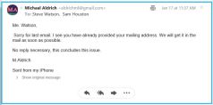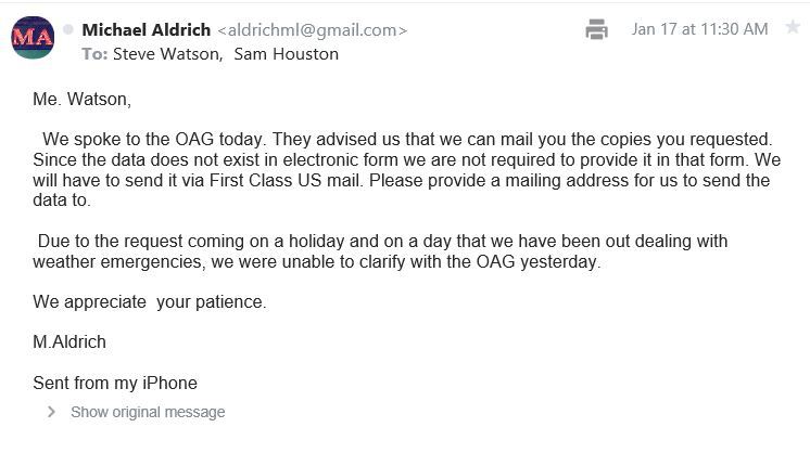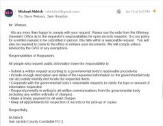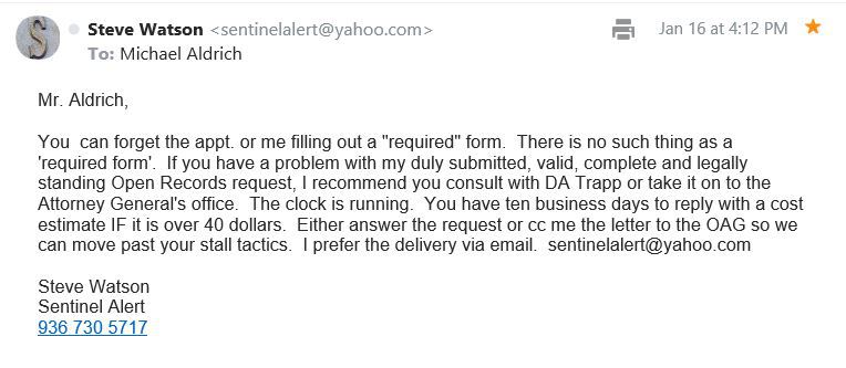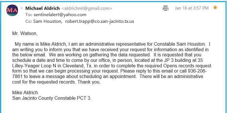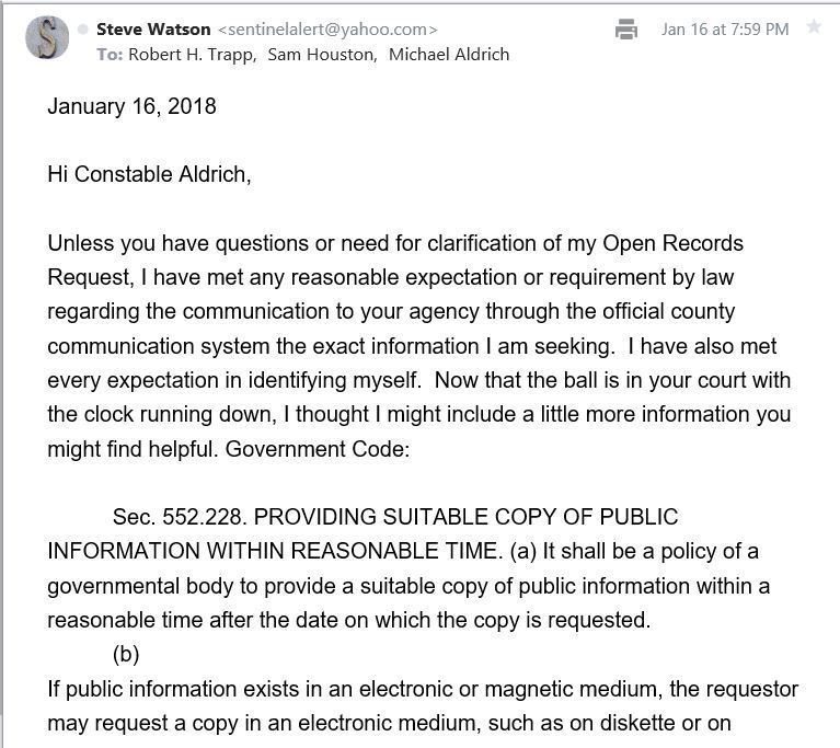 When The Sentinel first texted Sam Houston asking him for his email address, he called The Sentinel directly, not recognizing the number and offered, "Do you want my official email or personal?" My reply was, "I wanted the official email address, but I already found it." At this point, Houston asked, "Who is this?" to which I replied, "This is Steve Watson, publisher of The Sentinel Alert." There was an immediate, "Ohhhhhh, I have heard that name." CLICK. The Sentinel could not help but grin ear to ear on that note, finish the open records request I was composing and submitted it via Houston's official county email address.