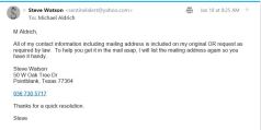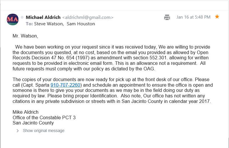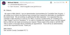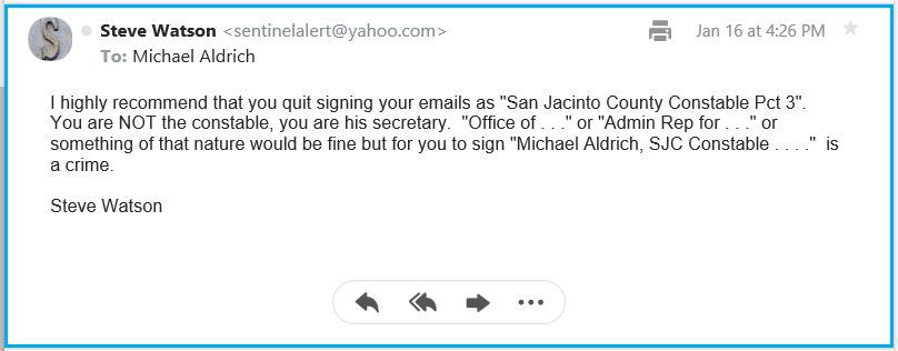 The chain of emails above was the entertaining result. Some points to note. My submission was via the county email address for Houston. The reply was on a 'gmail' address indicating a personal acct but the signature identified the sender as, "San Jacinto County Constable Pct 3". In good faith, The Sentinel warned whomever the imposter (not the constable) was that he was not the constable and for him to identify himself as such was a crime. We gave him some recommendations and moved on to the matter at hand. The imposter wrote me back with the 'gmail' acct and again identified himself as the constable.