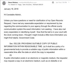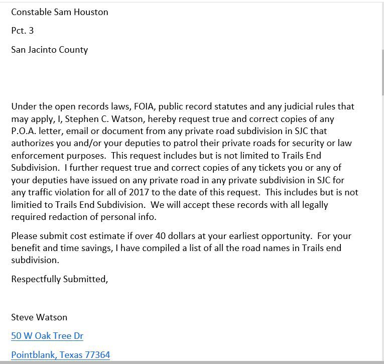 The private subdivision, it is alleged, has been the site of more than one 'traffic' stop by the Pct 3 constable and his deputies. Assertions by the constable that "The POA" gave him permission when questioned about the incidents were relayed to The Sentinel and led to the wording of the original O.R. Request submitted to Constable Sam Houston published just below. The twin columns of pictures below the original O.R. request is the timeline of emails that illustrates the utter disregard for the law that is constantly displayed by Sam Houston and his troops.
