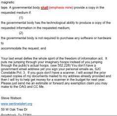The rest of the emails illustrate the ease they have in violating the law and one of the quickest about faces that we have seen in resistance to providing public information. I especially got a kick out of the attempt to force me to call and meet with “Capt” Peter Joseph Sparta to retrieve my documents.