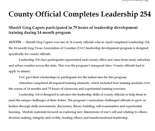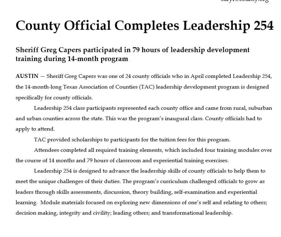 An 8 year active membership has evolved into more responsibility in leadership for our Sheriff Greg Capers. The national director, Josh Spaulding announced the addition of Sheriff Capers to the leadership council of the, "Fight Crime Invest In Kids" organization as a big step. With over 5,000 Police Chief/Sheriff and Prosecutormembers nationwide, Sheriff Capers contribution to and experience on the national leadership council will be more broadly effective as well as benefit SJC and East Texas overall.