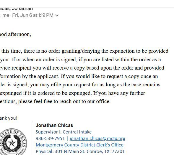 That is bad enough but then the judge violates everyone's rights and "blocks" the records so they cannot be obtained by open records. According to the spokesperson, Even I, named by name and by publication name in the motion for expunction, cannot request the signed copy by email but must appear in person to obtain a signed copy.