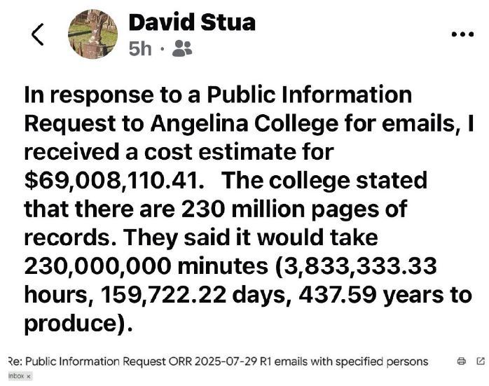 AI used to create and send an open records request that it will take 230million pages to answer and 437 years to fill hilights absurdity.